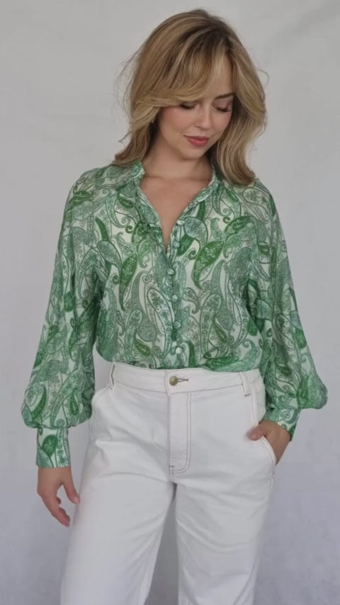 Indulge in the artful design of the Delray Blouse, featuring a captivating paisley print in shades of green. The relaxed fit and sheer fabric exude effortless elegance, making it a versatile piece for any occasion. With its delicate femininity and subtle allure, this blouse will surely elevate your wardrobe.