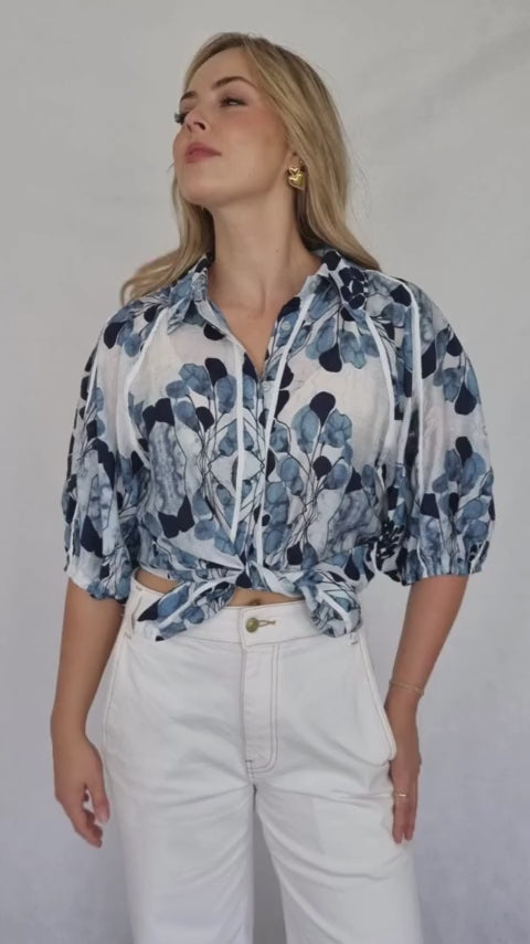 Introducing the Ester Blouse in Navy. A perfect blend of casual and chic, this lightweight blouse offers both comfort and breathability with its three-quarter sleeves. The blue and white floral print adds a touch of artistry, while the relaxed fit and button-front closure allow for versatile styling. The intricate detailing on the neckline and placket elevates the design, making it a must-have addition to your spring/summer wardrobe.