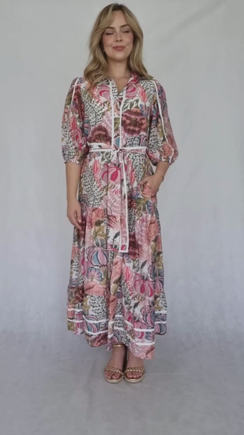 Elevate your summer wardrobe with the Rosalina Dress. Combining romance and bohemian style, this maxi dress boasts a vibrant floral print. The collared neckline, belted waist, and tiered skirt create a feminine silhouette, while the white piping adds a touch of sophistication. Perfect for any summer occasion.
