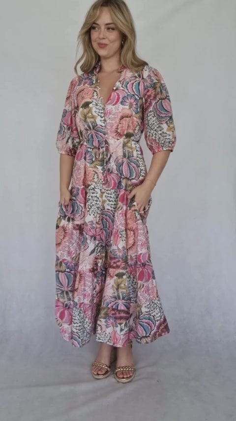 This maxi dress is a vibrant celebration of color and print. The flowing skirt and three-quarter sleeves create a romantic silhouette, while the bold floral pattern in shades of pink, red, and blue adds a touch of bohemian flair. The cinched waist creates a flattering shape, and the overall design is both playful and sophisticated.