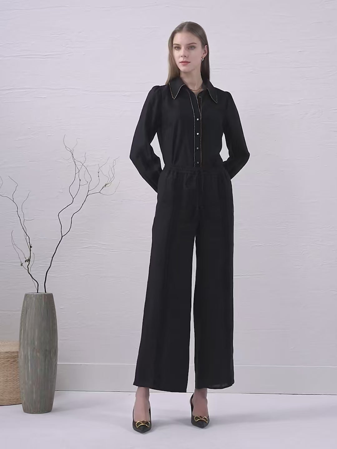 Nothing beats a trusty black blouse, and our Missika Tencel Balck Blouse for women is a testament to that. It's a stylish blouse that manages to steal the show with the golden embroidery going down the front and on the sleeves. The tiny buttons almost seem to blend in with the fabric to give the outfit a smooth finish. The Missika Tencel Blouse doesn't miss out on comfort, thanks to its cloud-like, lightweight, and breathable fabric. It's got a loosely-fitted silhouette to bring out the best in everybody. Accessorize with a simple necklace and some earrings, and you've got yourself a gorgeous little number.