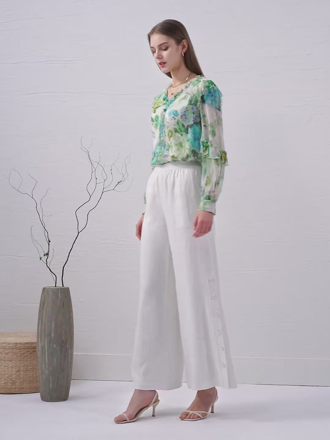 Switch up your summer dress for the perfect summer blouse, Rosie. It's a romantic silk blouse that features botanical prints in summery blues and greens with subtle pops from other colours. It has romantic ruffling detailing down the front and along the shoulders for a flowy finish. Even the sleeves flow out into tiered layers to create an eye-catching look. It's loosely fitted for an extra breezy look that encourages you to feel the summer breeze through your hair.  Wear Rosie to summer picnics, parties, or even barbeques. All you have to do is thrown on a pair of jeans or some flared white pants, and your summer look is complete.
