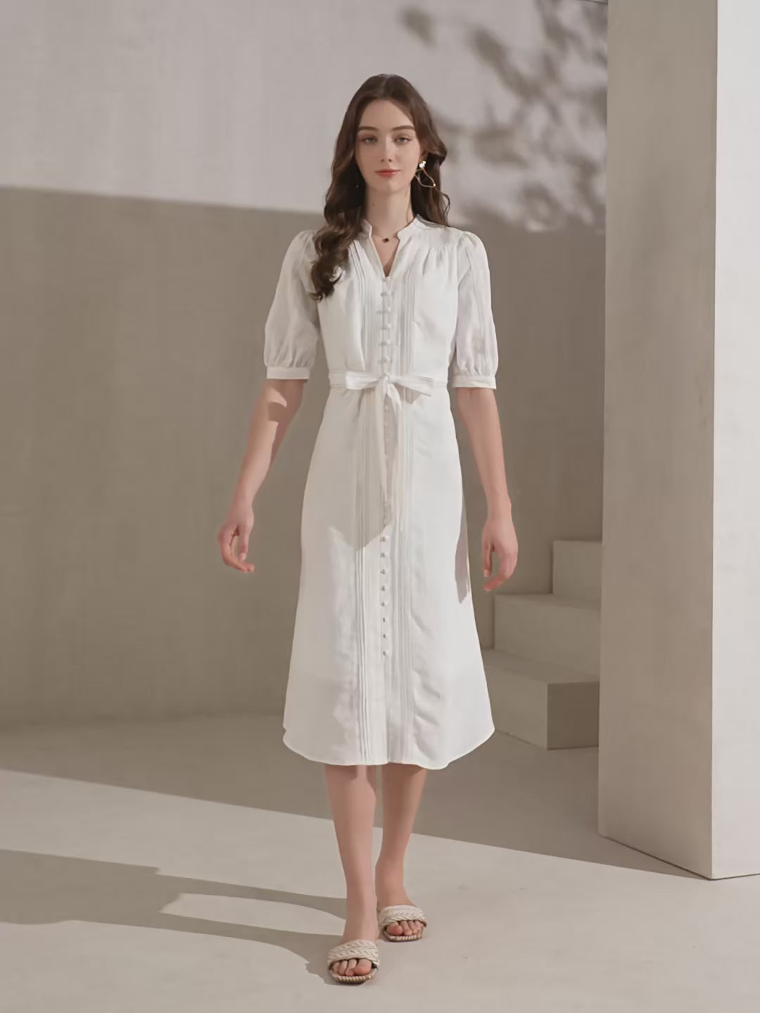 A standout element of this dress is its refined stand collar, which exudes a sense of polished elegance.The Tencel linen fabric is known for its exceptional breathability and moisture-wicking properties, making this dress ideal for warm weather. The fabric's natural drape and slight sheen enhance its luxurious feel, while the eco-friendly production process aligns with sustainable fashion practices.