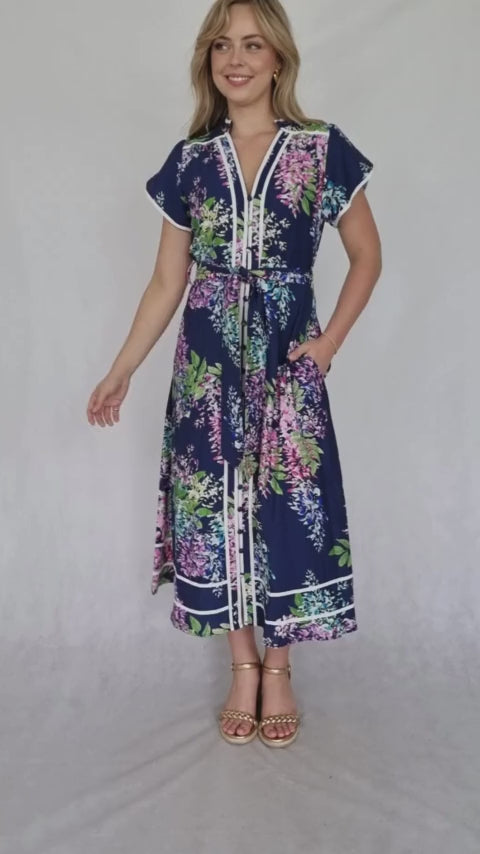 This elegant midi dress features a vibrant floral print on a deep navy floral, creating a striking contrast. The short sleeves, V-neckline, and belted waist create a flattering silhouette. The white piping detail adds a touch of refined sophistication, while the overall design exudes a sense of effortless chic.