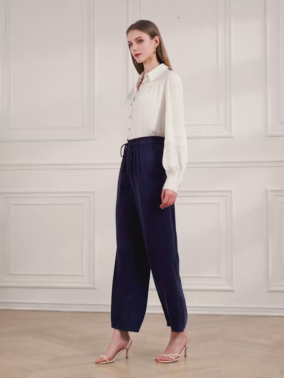 If you're tired of the same old black and white pants, you should switch things up with the navy blue Lia pants. They feature a slight flare at the bottom to draw attention to your shoes. They also have a drawstring closure at the front to create a casual look. The stitching intentionally hugs you in all the right places and flatters your shape. Its striking but simple navy color makes it a good fit for everything from work to dinner dates. For added convenience, it's made of cupro that stays nice and cool in the summertime.