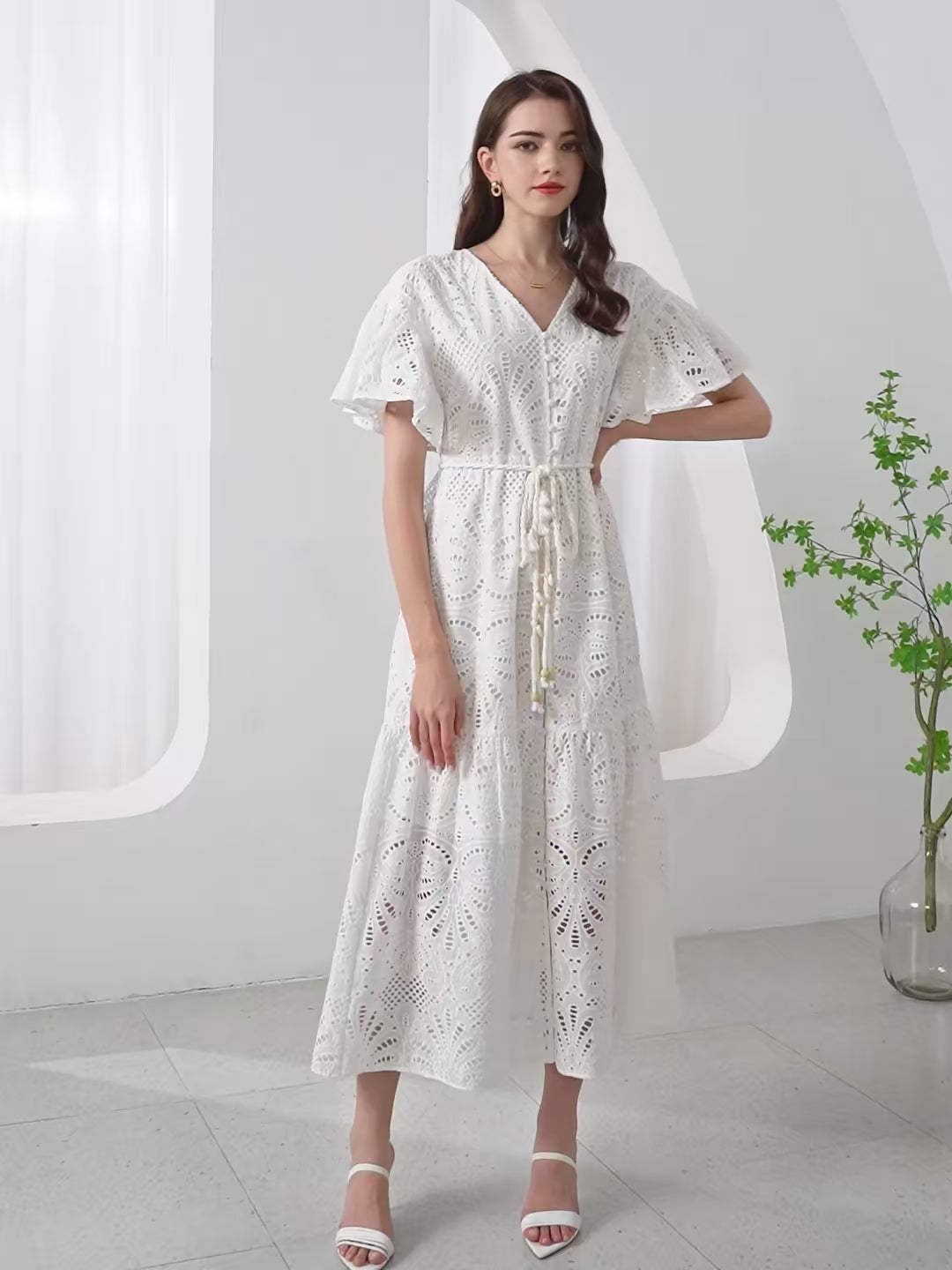 Step into a world of elegance with the stunning Margot Cotton Long Dress, adorned with intricate eyelet embroidery. The contrasting braided self-tie belt adds a touch of boho charm, while the exaggerated cap sleeves gracefully drape the shoulders, creating a look that is both chic and captivating. – lined