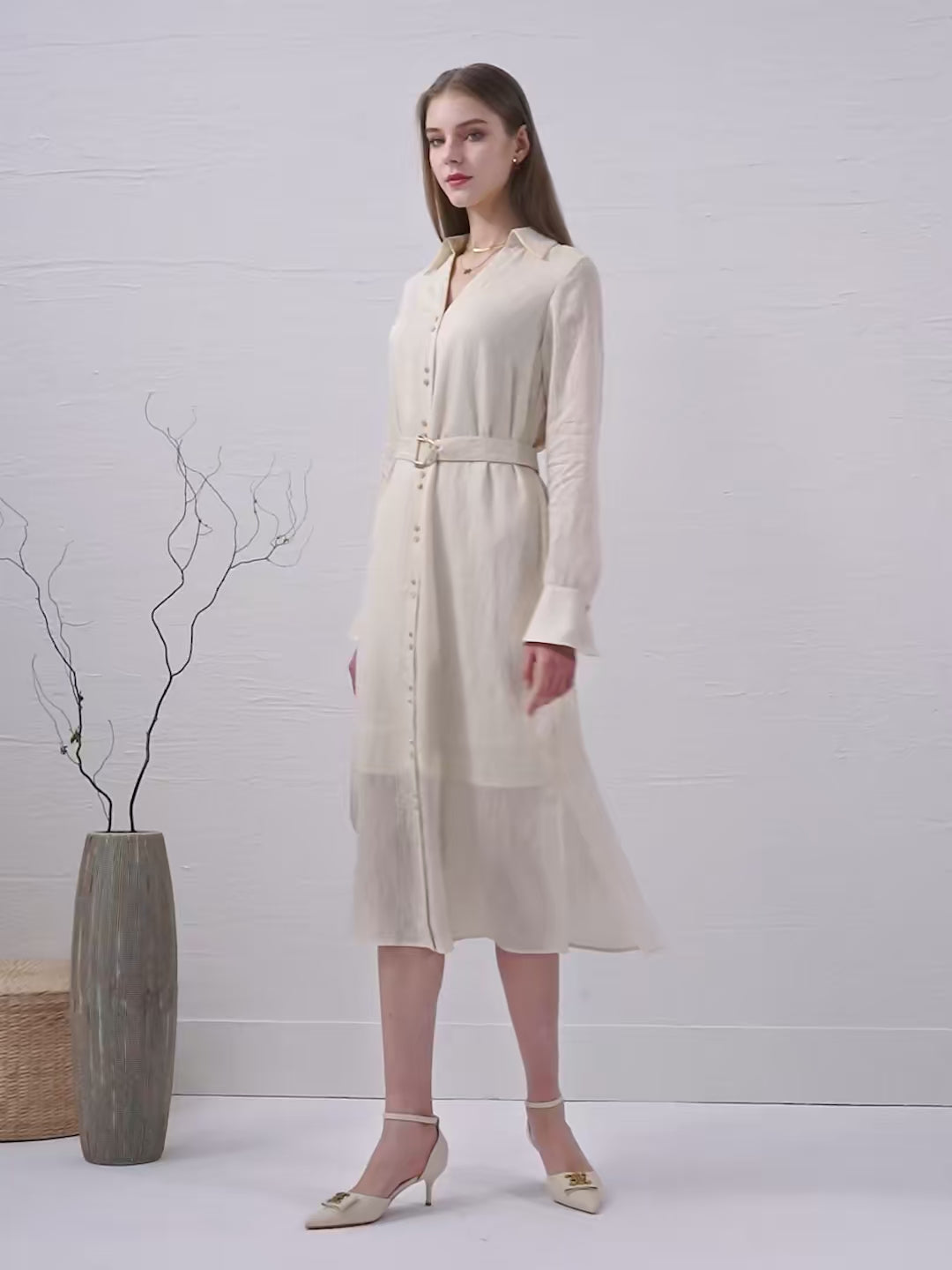 The Scarlette is a belted dress drenched in a timelessly feminine charm. It's a sophisticated cream dress that doesn't need to be over-the-top to allure the eye. The flecks of gold throughout the fit bring some nuanced glamour. It features pairs of golden buttons going down to the bottom to draw the eye across your entire outfit. For a more elegant look, throw on the golden belt, or keep it off to keep things more relaxed. The belt will not only bring some grace to the outfit but also accentuate your feminine frame. The Scarlette is a match made in heaven for the ones who value subtle glamour.