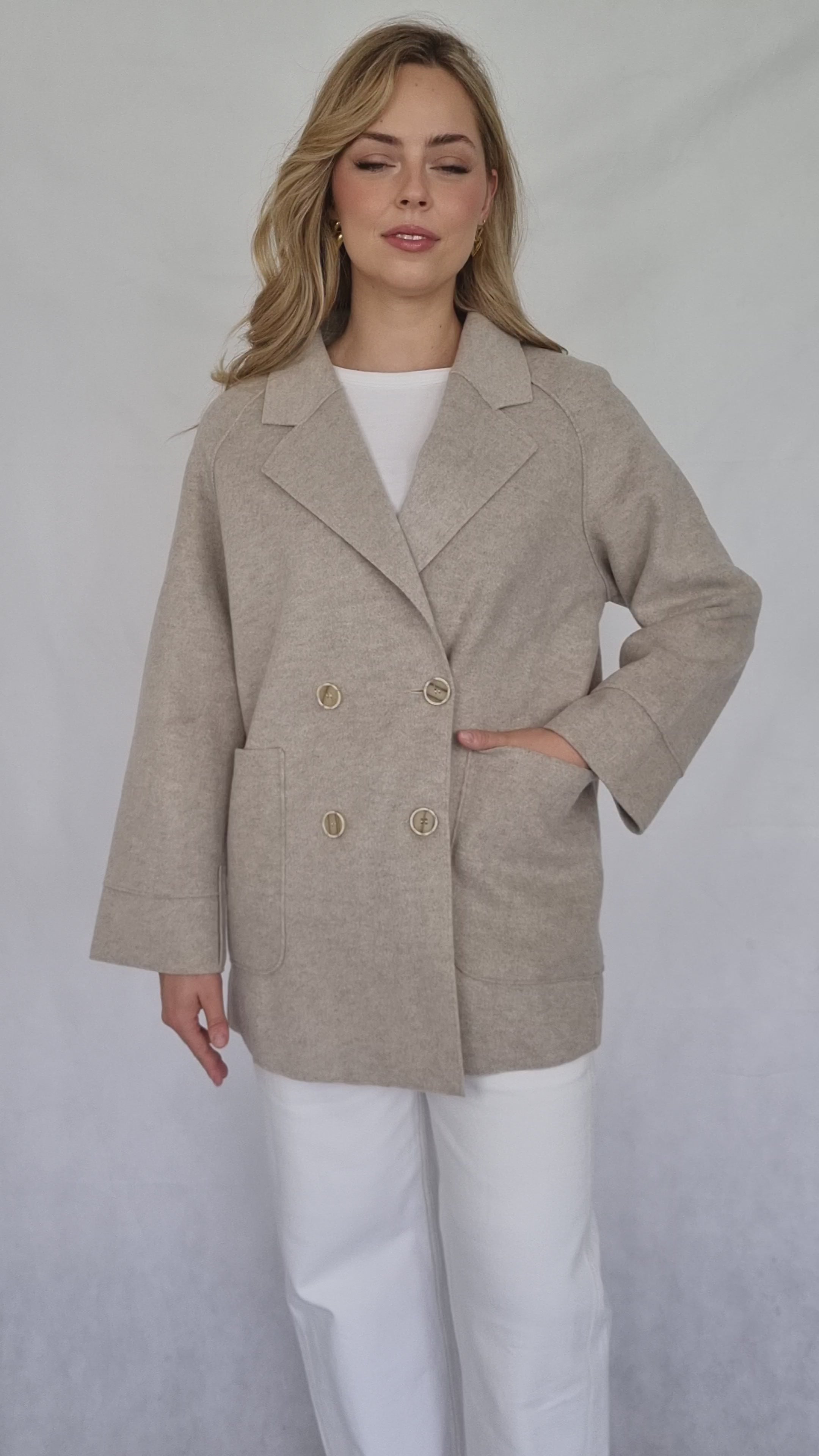 This sophisticated double-breasted coat is crafted from a soft, light gray wool-blend fabric. The relaxed fit and wide lapels create a timeless and effortlessly chic silhouette. Subtle, light-colored buttons add a touch of understated elegance, while the patch pockets provide both practicality and a touch of casual charm.