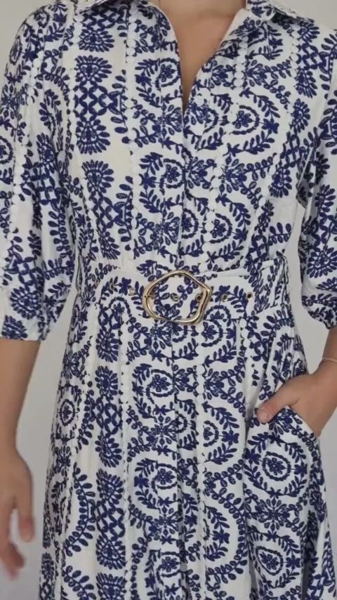 This elegant midi dress features a striking blue and white embroidered pattern inspired by classic toile designs. The shirt-style bodice, cinched at the waist with a belt, enhances your silhouette with a tailored fit. With three-quarter sleeves and a graceful A-line skirt, it brings modern sophistication to your wardrobe, perfect for a variety of occasions.